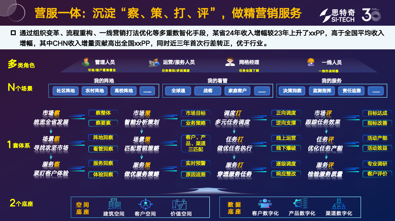 針對(duì)運(yùn)營商大市場(chǎng)運(yùn)營的核心痛點(diǎn),思特奇"市場(chǎng)全息作戰(zhàn)"方案以"存增一體、營服一體"為戰(zhàn)略目標(biāo),構(gòu)建全鏈路指揮作戰(zhàn)體系,沉淀"察、策、打、評(píng)"四大核心能力,徹底激活市場(chǎng)數(shù)智化轉(zhuǎn)型動(dòng)能。該體系通過組織架構(gòu)革新打破部門壁壘、流程重構(gòu)優(yōu)化業(yè)務(wù)鏈路、一線打法升級(jí)提升執(zhí)行效能,形成"數(shù)據(jù)驅(qū)動(dòng)決策、智能賦能執(zhí)行"的閉環(huán)運(yùn)營模式。