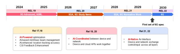 AI能力最早出現(xiàn)在3GPP Release 17版本中,并在Release 18中得到擴(kuò)展。未來的版本預(yù)計(jì)將從AI協(xié)同網(wǎng)絡(luò)(AI管理離散網(wǎng)絡(luò)功能)向AI原生架構(gòu)(AI深度嵌入整個(gè)網(wǎng)絡(luò)堆棧)過渡(圖1)。在6G時(shí)代,AI將滲透每一層,釋放前所未有的性能與自動化水平。盡管3GPP標(biāo)準(zhǔn)并未覆蓋所有層級,但創(chuàng)新正在貫穿整個(gè)網(wǎng)絡(luò)堆棧,部分供應(yīng)商和運(yùn)營商已開始在網(wǎng)絡(luò)中直接部署AI模型。