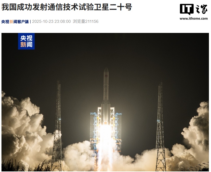 10 月 23 日消息,據(jù)央視新聞報(bào)道,北京時(shí)間 2025 年 10 月 23 日 22 時(shí) 30 分,我國在文昌航天發(fā)射場使用長征五號(hào)運(yùn)載火箭,成功將通信技術(shù)試驗(yàn)衛(wèi)星二十號(hào)發(fā)射升空,衛(wèi)星順利進(jìn)入預(yù)定軌道,發(fā)射任務(wù)獲得圓滿成功。該衛(wèi)星主要用于開展多頻段、高速率衛(wèi)星通信技術(shù)驗(yàn)證