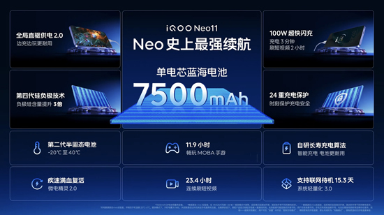 iQOO Neo11內(nèi)置7500mAh 超薄藍海電池,采用第二代半固態(tài)與第四代硅負極技術(shù),能量密度達 849Wh/L,-20℃極寒環(huán)境仍能穩(wěn)定供電。搭配 100W 超快閃充,實現(xiàn) “充電 3 分鐘,抖音 2 小時” 的回血速度,全局直驅(qū)供電 2.0 技術(shù)可智能溫控,邊充邊玩不燙手。​