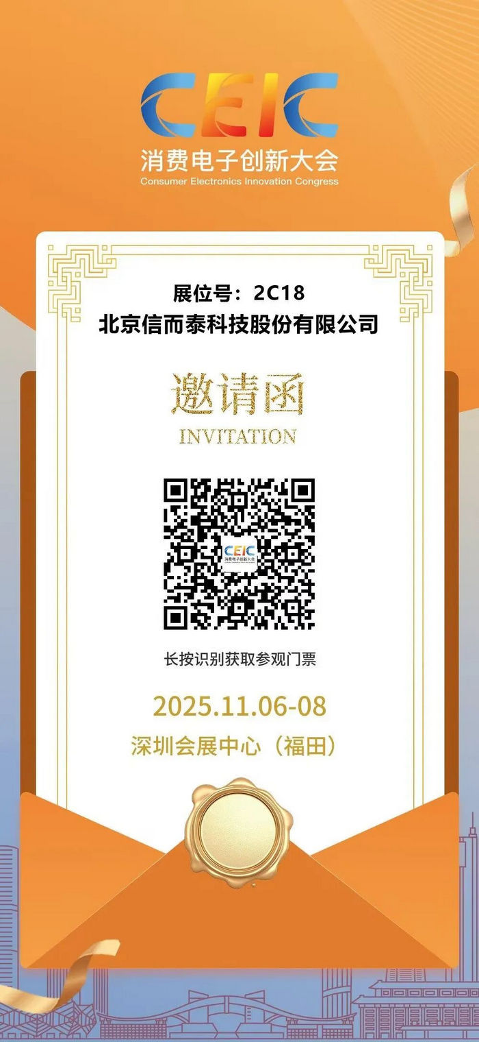 北京信而泰科技股份有限公司誠(chéng)摯邀請(qǐng)您蒞臨 2025消費(fèi)電子創(chuàng)新大會(huì)(CEIC 2025) ,與我們共同探索消費(fèi)電子領(lǐng)域的前沿技術(shù)與創(chuàng)新應(yīng)用。本次大會(huì)將于 2025年11月6日至8日 在 深圳會(huì)展中心(福田)2號(hào)館 隆重舉行,我司展位號(hào)為 2C18,期待與您相見(jiàn)!