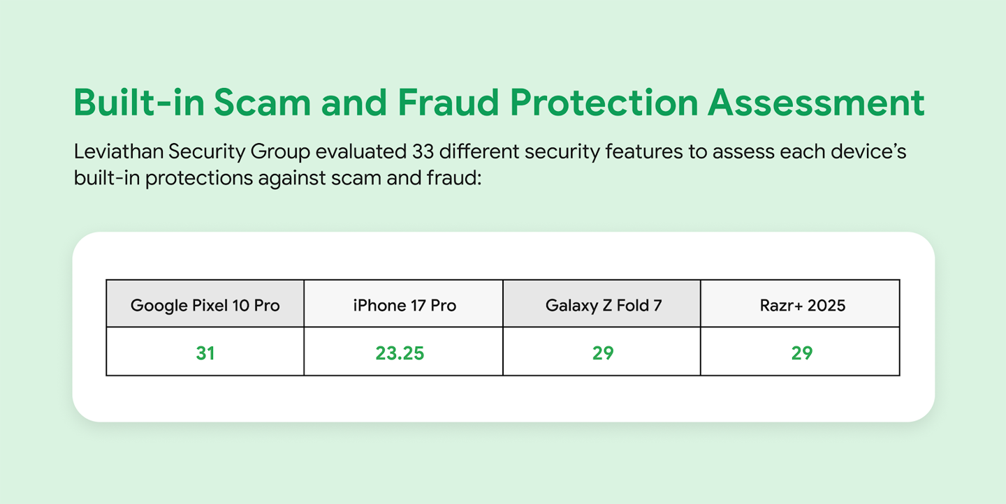 另一家安全公司 Leviathan Security Group 的評(píng)估結(jié)果更為直接,將 Pixel 10 Pro 列為默認(rèn)詐騙防護(hù)能力最強(qiáng)的設(shè)備,領(lǐng)先于其他安卓旗艦機(jī)型和 iPhone 17 Pro。