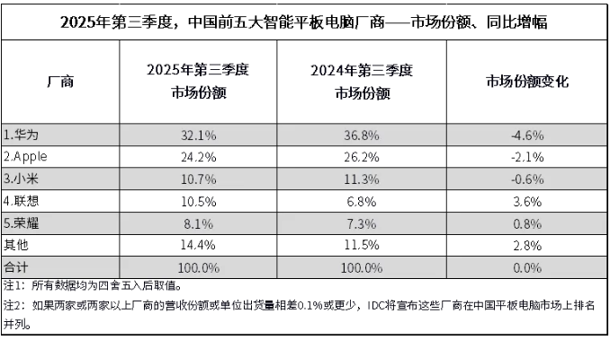 IDC 報(bào)告:2025 年 Q3 中國(guó)平板電腦市場(chǎng)出貨量 849 萬(wàn)臺(tái)同比增長(zhǎng) 10.9%,華為、蘋果、小米前三