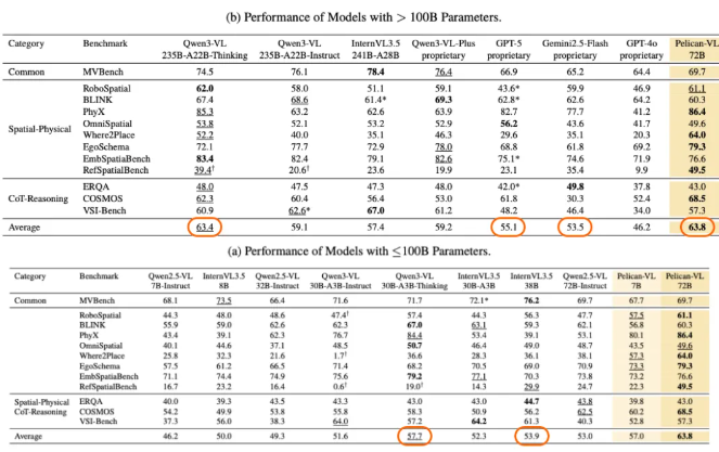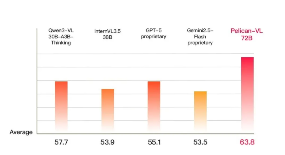 本次開源的 Pelican-VL 1.0 的核心優(yōu)勢在于深度整合海量數(shù)據(jù)與自適應(yīng)學習機制,在由 1000+ A800 GPU 組成的集群上訓練,單次檢查點訓練耗費超過 50,000 A800 GPU-小時;團隊從原始數(shù)據(jù)中蒸餾出的包含數(shù)億 token 的高質(zhì)量元數(shù)據(jù)以做訓練基石;谏鲜鰞(yōu)勢,Pelican-VL 1.0 實現(xiàn)了在基線基礎(chǔ)上性能提升 20.3%,平均超過 Qwen3-VL 系列、InternVL3.5 系列等同級別開源模型 10.6%。