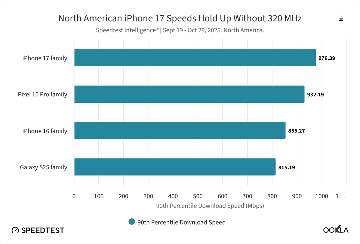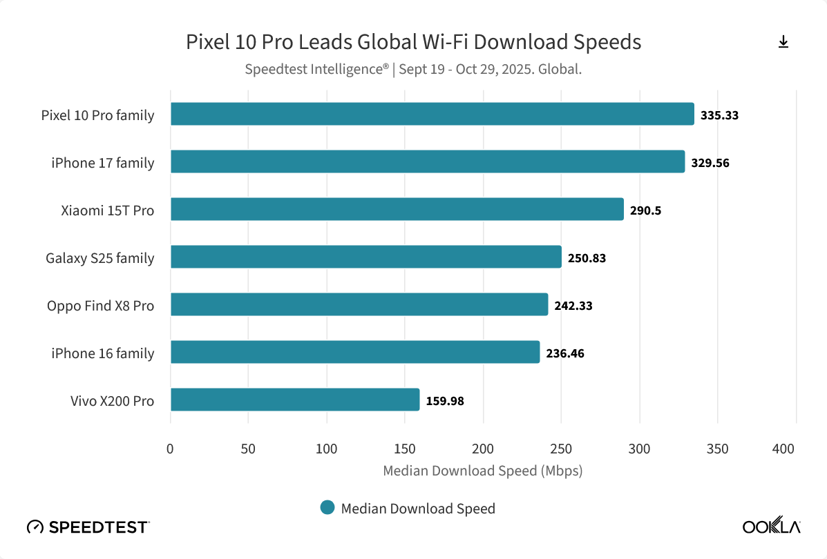 在與安卓旗艦的對決中,蘋果并未取得全面領(lǐng)先。谷歌 Pixel 10 Pro 憑借 335.33 Mbps 的全球中位數(shù)下載速度,以微弱優(yōu)勢險勝 iPhone 17,成為該項指標(biāo)的冠軍。