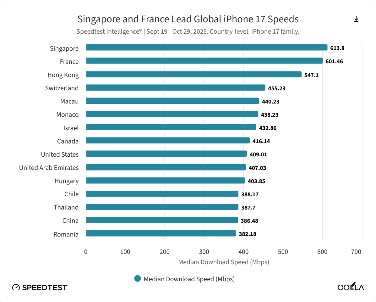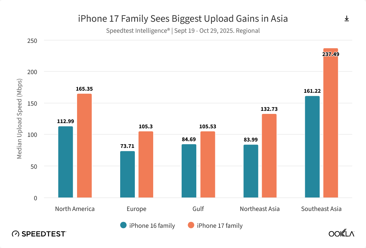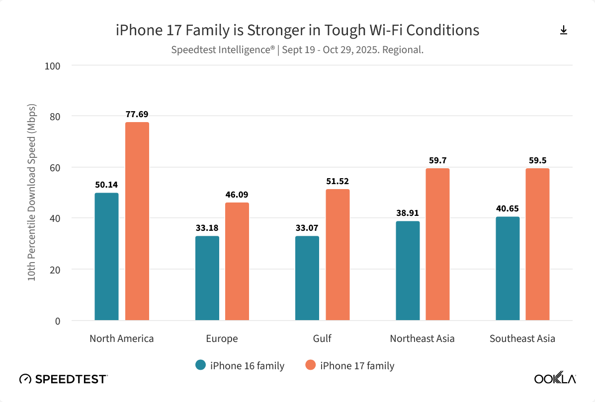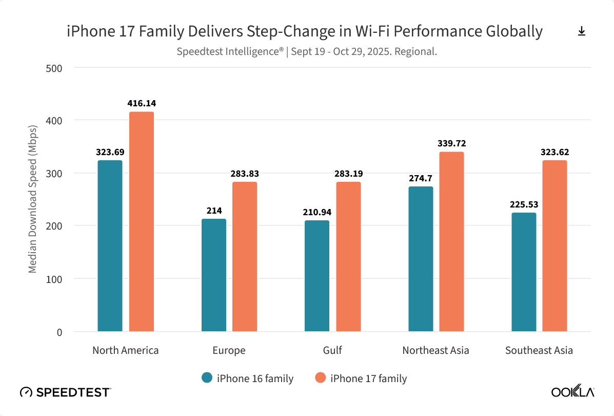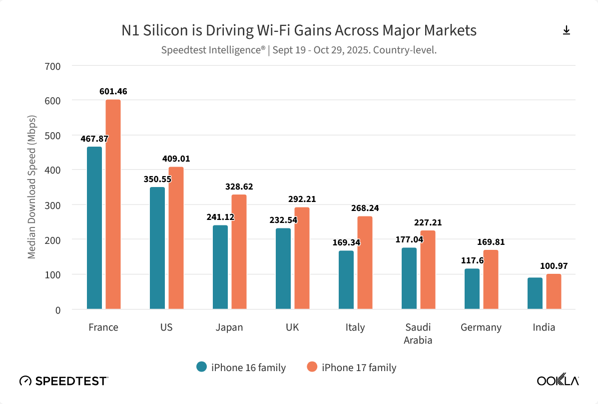 11 月 18 日消息,測速機構(gòu) Ookla 昨日(11 月 17 日)發(fā)布最新《Speedtest Intelligence》報告,指出 2025 年成為 Wi-Fi 技術(shù)競爭的關(guān)鍵年份,蘋果公司正式在 iPhone 17 系列中推出其首款自研無線網(wǎng)絡(luò)芯片 N1,相比較 iPhone 16 系列,全球上傳和下載中位數(shù)增幅均達(dá)到 40%。