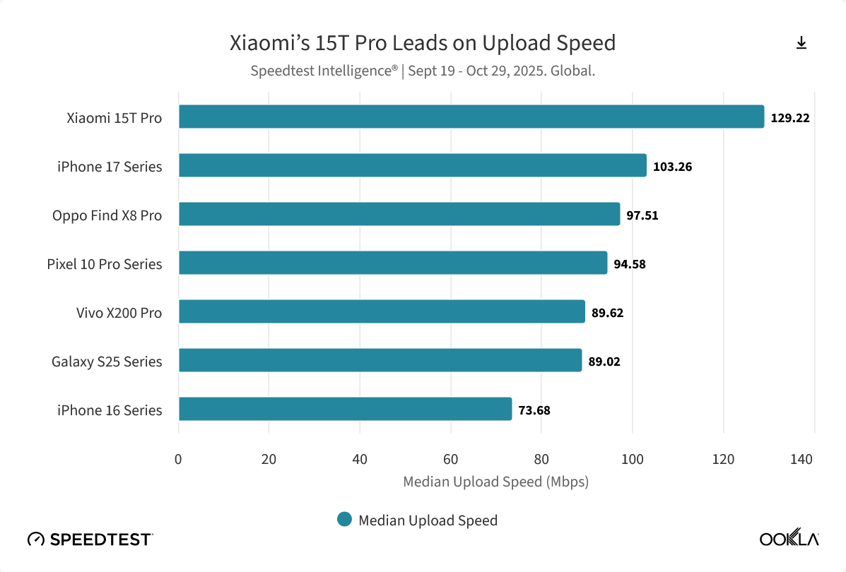 而在上傳性能和延遲控制方面,搭載聯(lián)發(fā)科天璣 9400 (+) 平臺的小米 15T Pro 表現(xiàn)最為搶眼,其全球中位數(shù)上傳速度和多服務(wù)器延遲(15 毫秒)均排名第一。
