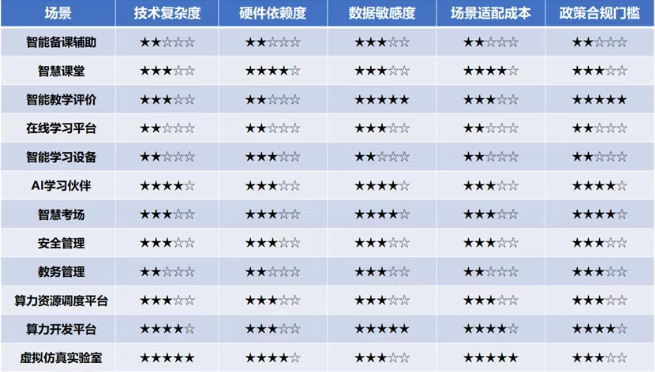 3. 梳理算力賦能教育行業(yè)典型應(yīng)用場景。“算力+教育”的應(yīng)用場景通過歸納主要分為四大部分,分別為教學(xué)場景、學(xué)習(xí)場景、管理場景以及科研場景,由于不同應(yīng)用場景之間存在差別以及技術(shù)層面的不同,因此不同場景的部署難度以及技術(shù)成熟度存在差異性。部署難度方面,不同應(yīng)用場景下,“算力+”的賦能模式需要結(jié)合技術(shù)復(fù)雜度、硬件依賴度、數(shù)據(jù)敏感度、場景適配成本以及政策合規(guī)情況進(jìn)行部署難度的判斷,對(duì)四大類場景中的12個(gè)具體場景進(jìn)行多維度的分析。
