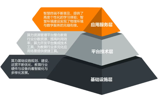 1. 明確算力賦能教育行業(yè)發(fā)展內(nèi)涵。算力賦能教育是算力賦能千行百業(yè)轉(zhuǎn)型中的重點(diǎn)領(lǐng)域之一,是以算力資源為核心底層支撐的教育創(chuàng)新模式,通過“人工智能+教育”等技術(shù)融合路徑,將算力深度滲透至教育教學(xué)、學(xué)習(xí)體驗(yàn)、管理服務(wù)、科研創(chuàng)新全環(huán)節(jié),為各環(huán)節(jié)提供數(shù)據(jù)處理、智能分析、場景優(yōu)化等關(guān)鍵能力,最終助力教育行業(yè)實(shí)現(xiàn)教、學(xué)、管、研的高質(zhì)量發(fā)展,推動(dòng)教育行業(yè)數(shù)字化轉(zhuǎn)型。