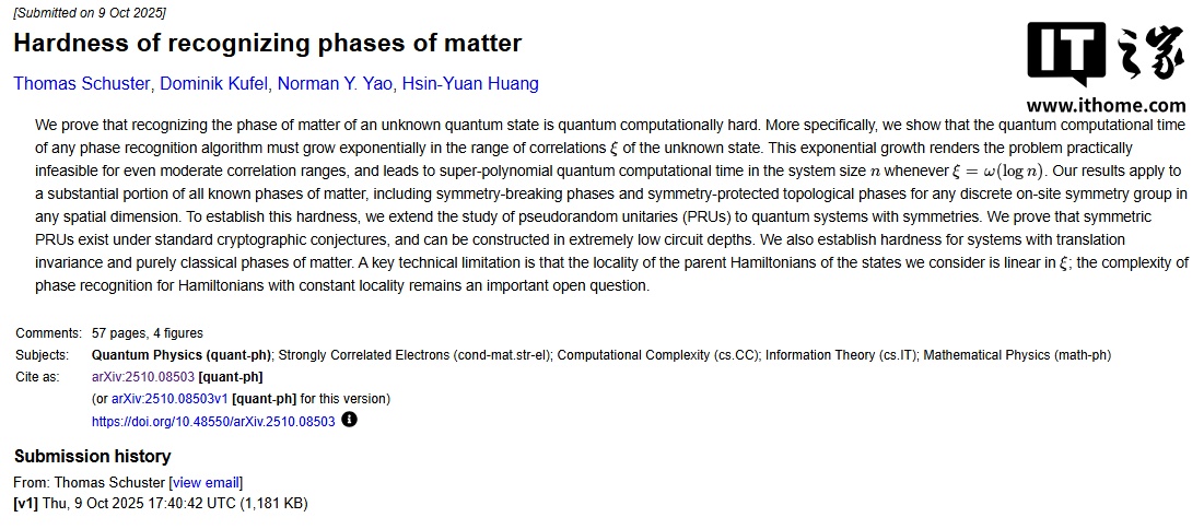 11 月 1 日消息,量子計(jì)算通常被視為破解復(fù)雜問題的關(guān)鍵,但加州理工學(xué)院(Caltech)研究人員發(fā)現(xiàn),即便是最先進(jìn)的量子計(jì)算機(jī)也存在無法求解(或者說需要“無限時(shí)間”才能解出)的問題 —— 識別未知量子態(tài)的物質(zhì)相 / 相態(tài)(phase of matter)。相關(guān)研究成果已發(fā)表于預(yù)印本平臺 arXiv。