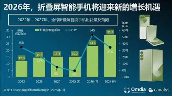 Canalys預測,2025年全球折疊屏手機出貨量將維持在1520萬臺左右,但2026年將迎來爆發(fā)式增長: