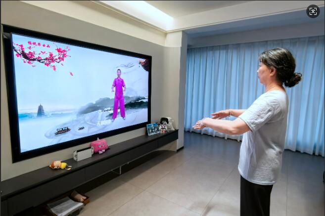 而在鹽城,移動(dòng)高清電視則讓傳統(tǒng)養(yǎng)生保健煥發(fā)出新生。陳奶奶一聲“跳廣場(chǎng)舞”,虛擬管家“靈犀”便出現(xiàn)在屏幕上,同步啟動(dòng)AI健身模式,手機(jī)攝像頭與電視聯(lián)動(dòng),實(shí)時(shí)捕捉她的動(dòng)作,顯示姿勢(shì)是否正確。不多時(shí),陳爺爺也來(lái)到了客廳,隨著一句“繼續(xù)播放楊氏太極”,電視秒切換,老兩口開始跟著電視畫面一起練習(xí)。