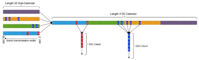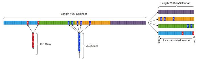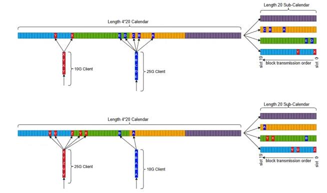 FlexE Shim 時隙配置,通過 Calendar 機制,為每個Client接口提供靈活、動態(tài)可調(diào)的配置。不同速率的Client接口,F(xiàn)lexE Shim將其業(yè)務數(shù)據(jù)按5G的顆粒度,靈活分配到業(yè)務承載通道上,實現(xiàn)多種速率接口靈活復用。