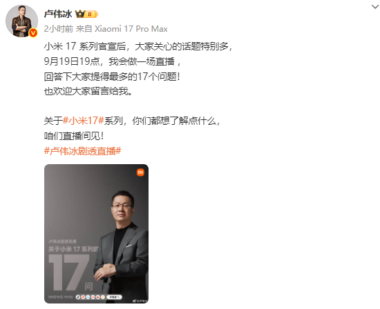 小米集團合伙人、總裁,手機部總裁,小米品牌總經(jīng)理盧偉冰今天下午宣布,自己將在9月19日19時開啟一場直播,回答關(guān)于小米17系列“大家提得最多的 17 個問題”。