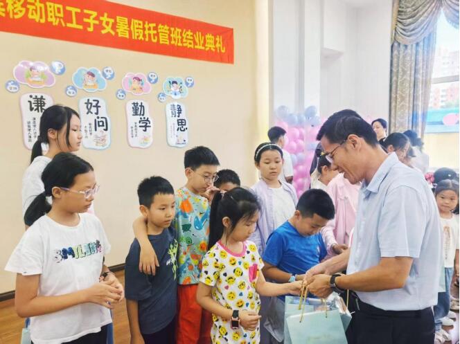 畢業(yè)典禮現(xiàn)場(chǎng)充滿童趣與溫情,哈爾濱移動(dòng)工會(huì)主席為每個(gè)孩子送上了一份開(kāi)學(xué)禮物并發(fā)表致辭,回顧了托管期間的點(diǎn)點(diǎn)滴滴。他提到,本次托管班圍繞“安全、快樂(lè)、成長(zhǎng)”三大核心,不僅為孩子們安排了作業(yè)輔導(dǎo)、興趣拓展、趣味運(yùn)動(dòng)等活動(dòng),還讓孩子們?cè)谳p松氛圍中收獲知識(shí)、結(jié)交伙伴、提升能力。
