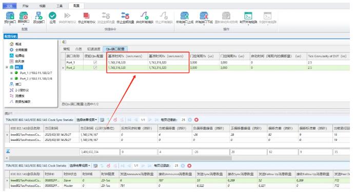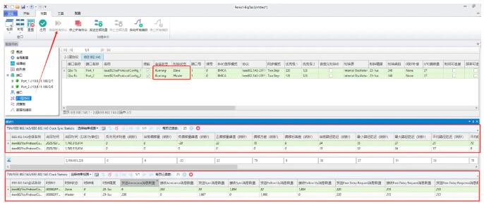 配置AS協(xié)議并點擊完成,在配置導(dǎo)航欄中可看到生成的AS協(xié)議,點擊啟動所有協(xié)議,能看到測試儀Telkerd端口AS時鐘狀態(tài)為Slave,Listener端口AS時鐘狀態(tài)為Master,統(tǒng)計中能看到時間偏移量及協(xié)議包交互數(shù)量均正常,時間同步是Qbv調(diào)度基準時間的基石,需優(yōu)先確保其建立成功。