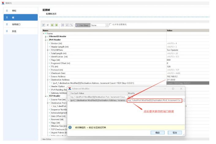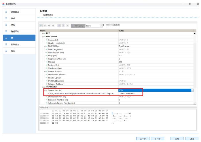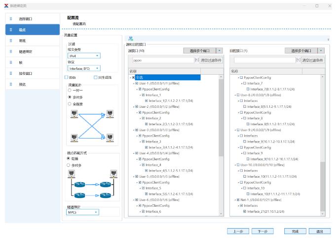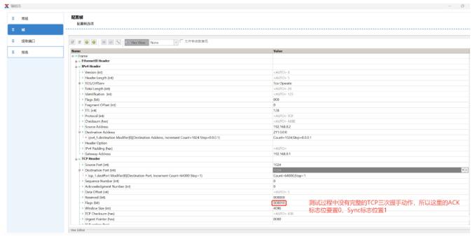創(chuàng)建用戶側(cè)到網(wǎng)絡(luò)側(cè)的上行流量,添加UDP/TCP頭,設(shè)置源端口跳變,使每個(gè)用戶打滿端口塊,實(shí)現(xiàn)最大并發(fā)session數(shù)測(cè)試: