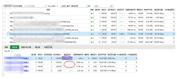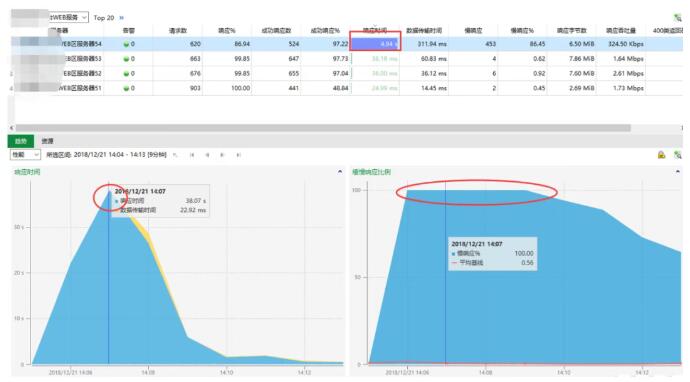 此外,從HTTP應用性能分析模塊回溯數據,發(fā)現同一個URL有的不同服務器提供服務,對比各個服務器的響應時間,發(fā)現只有“xxx.xxx.xxx.54”這個服務器的響應時間異常。